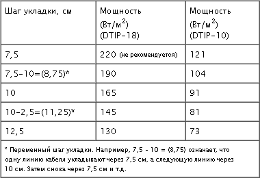 Далі необхідно визначити крок укладання кабелю. Крок укладання дозволяє зберігати ту потужність на 1 м², яку розраховують і закладають на етапі проектування (див. Таблицю).