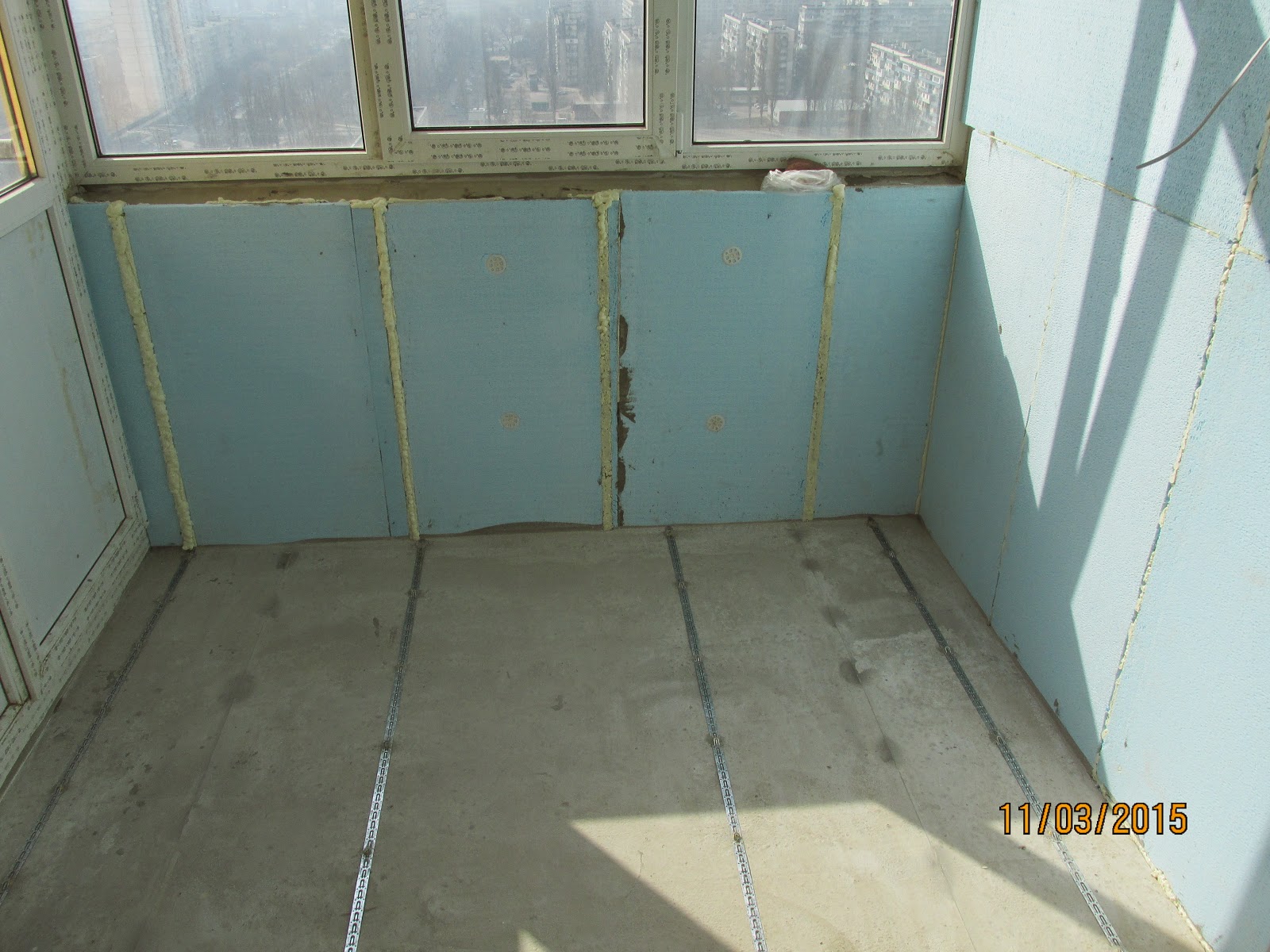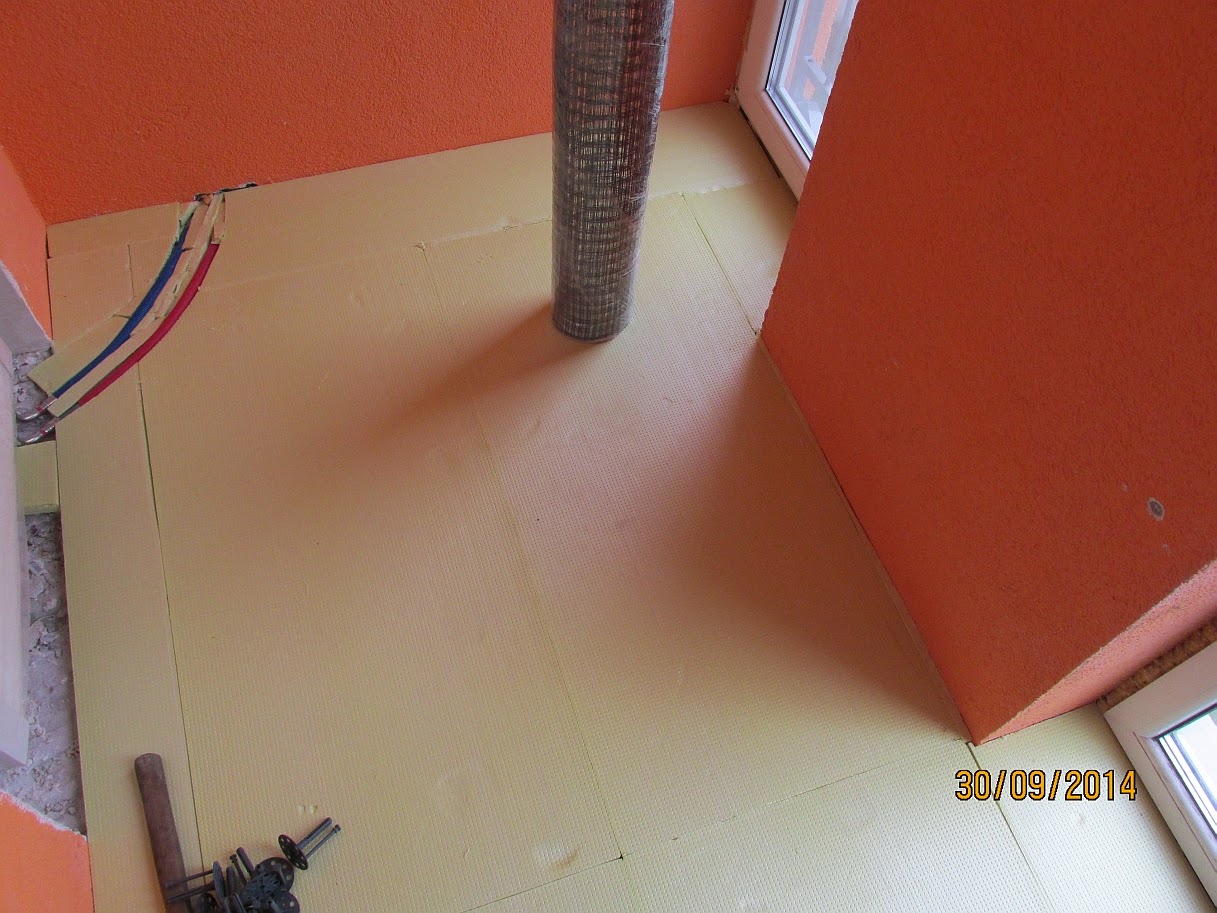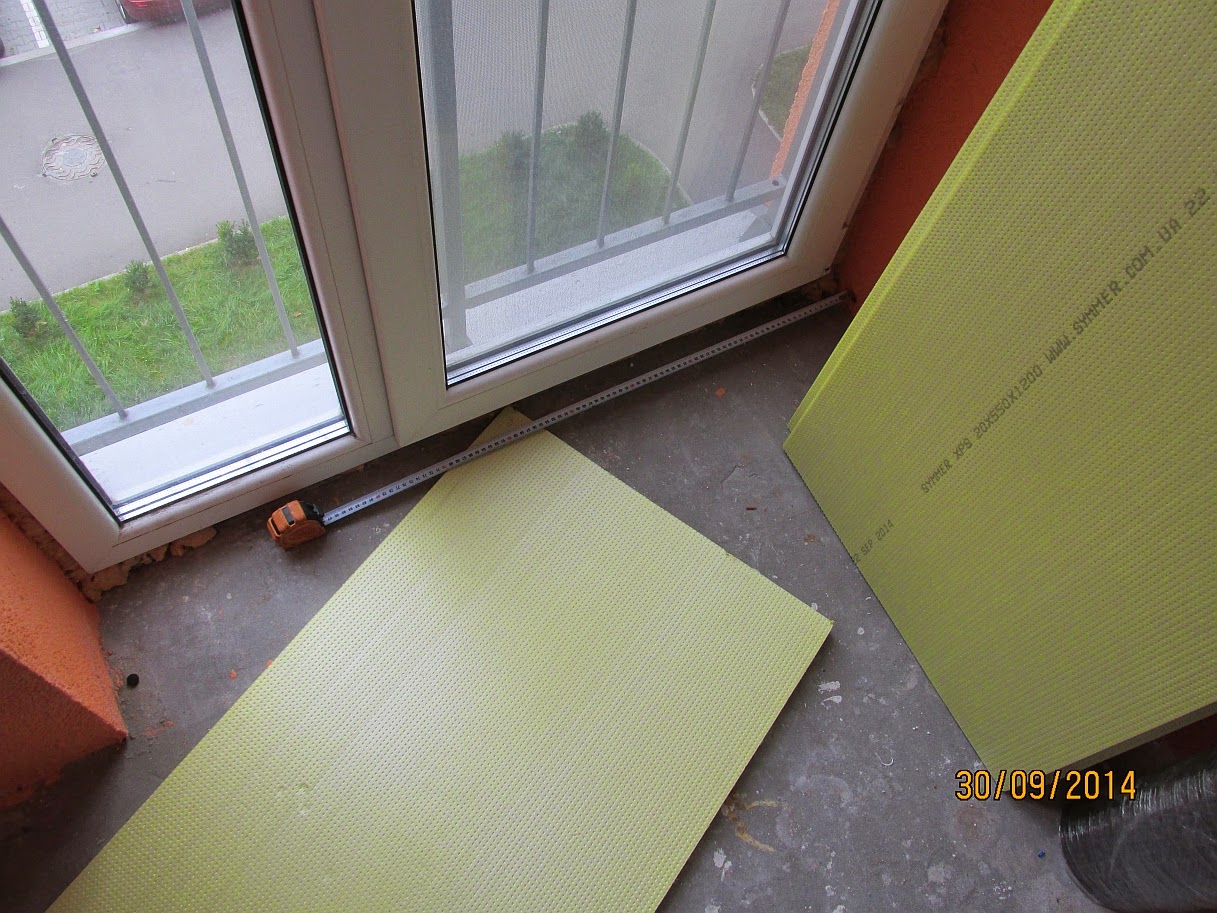 На досить рівну основу готової стяжки щільно укладаються листи теплоізоляції на всю площу балкона і потім прибиваються парасольками разом з штукатурною металевою сіткою. Якщо підлога не рівне, то краще їх приклеїти спеціальним клеєм для ЕППС.