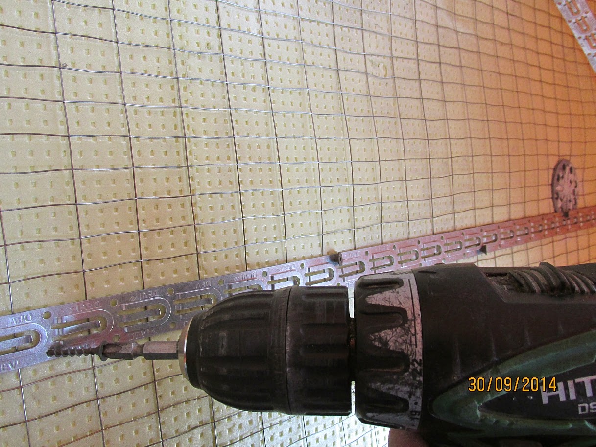 Шуруповертом закріплюється монтажна стрічка для нагрівального кабелю. Шурупи в утеплювач закручуються під кутом і в напрямку ланок монтажної стрічки, потім не заважають закриття замків. Відстань між стрічкою в 50-70 см буде достатнім для надійного кріплення нагрівального кабелю, щоб не збивалися його лінії і витримувався крок укладання. Можна закріпити кабель і хомутами, але це довше за часом і незручно при укладанні кабелю, коли прокидати весь кабель по довжині на площі обігріву та регулюється кроком укладання на стрічці його довжина.